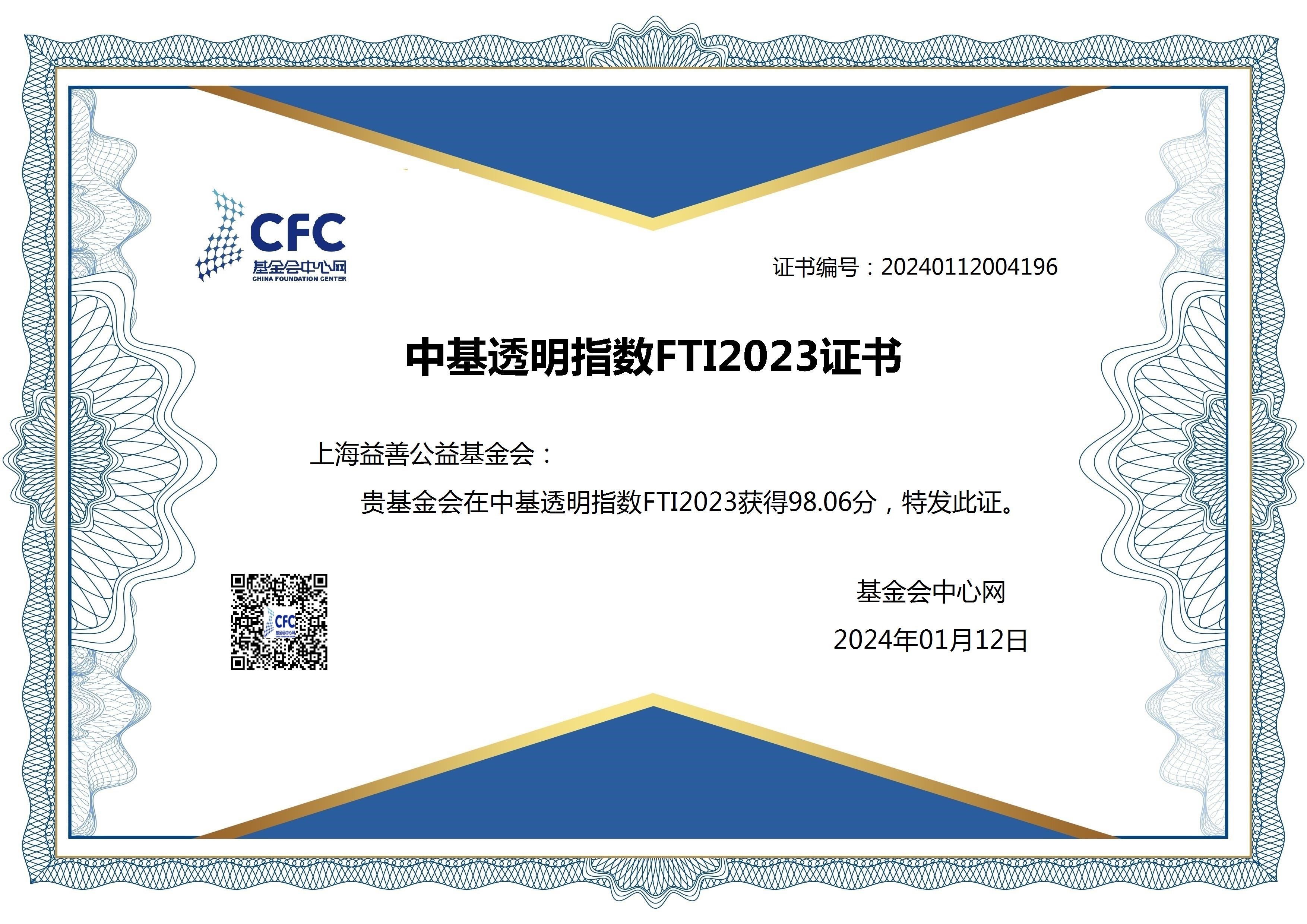 2024年1月12日,基金会中心网发布中基透明指数FTI2023榜单,上海益善公益基金会喜获“中基透明指数FTI2023榜单” 98.06分,得分超过全国基金会98.88%