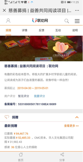 2019年5月1日,CMC华人文化集团在联劝网上线2019CMC公益跑项目,为益善共同阅读计划募捐