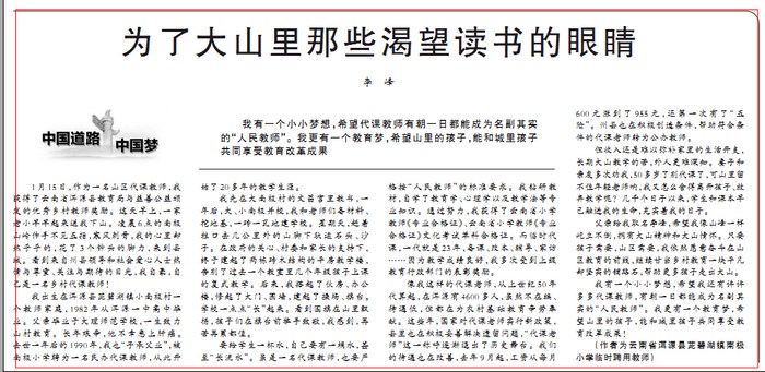 《人民日报》( 2014年01月22日 05 版)我有一个小小梦想,希望代课教师有朝一日都能成为名副其实的“人民教师”。我更有一个教育梦,希望山里的孩子,能和城里孩子共同享受教育改革成果。