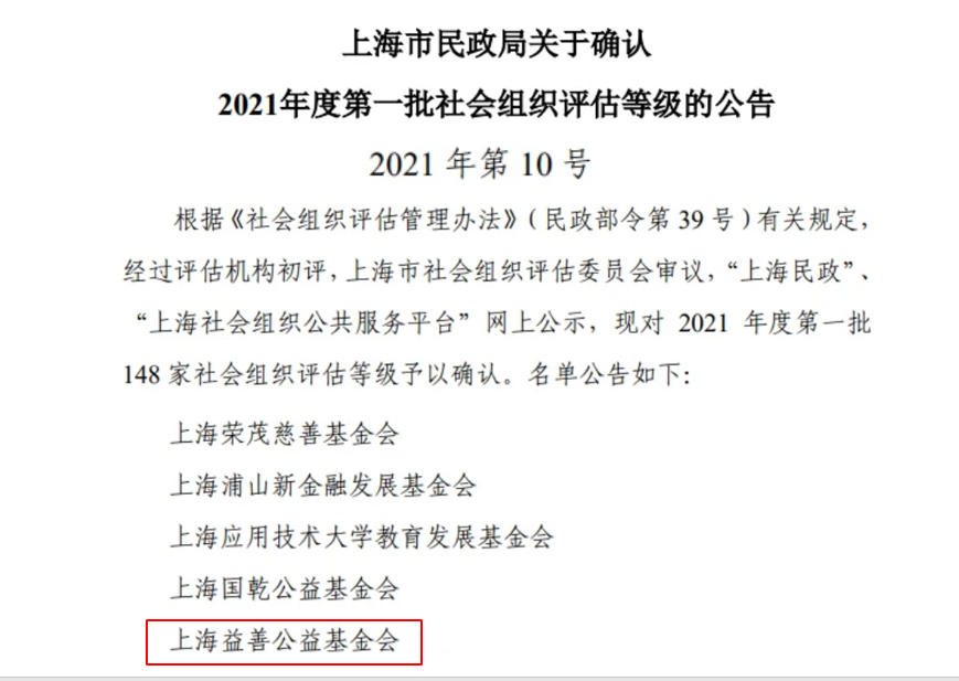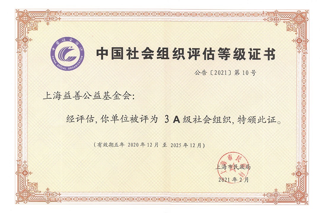 2021年3月1日,上海社会组织网传来喜讯。根据上海市民政局〔2021〕10 号公告显示,基金会正式获评获评3A等级社会组织。