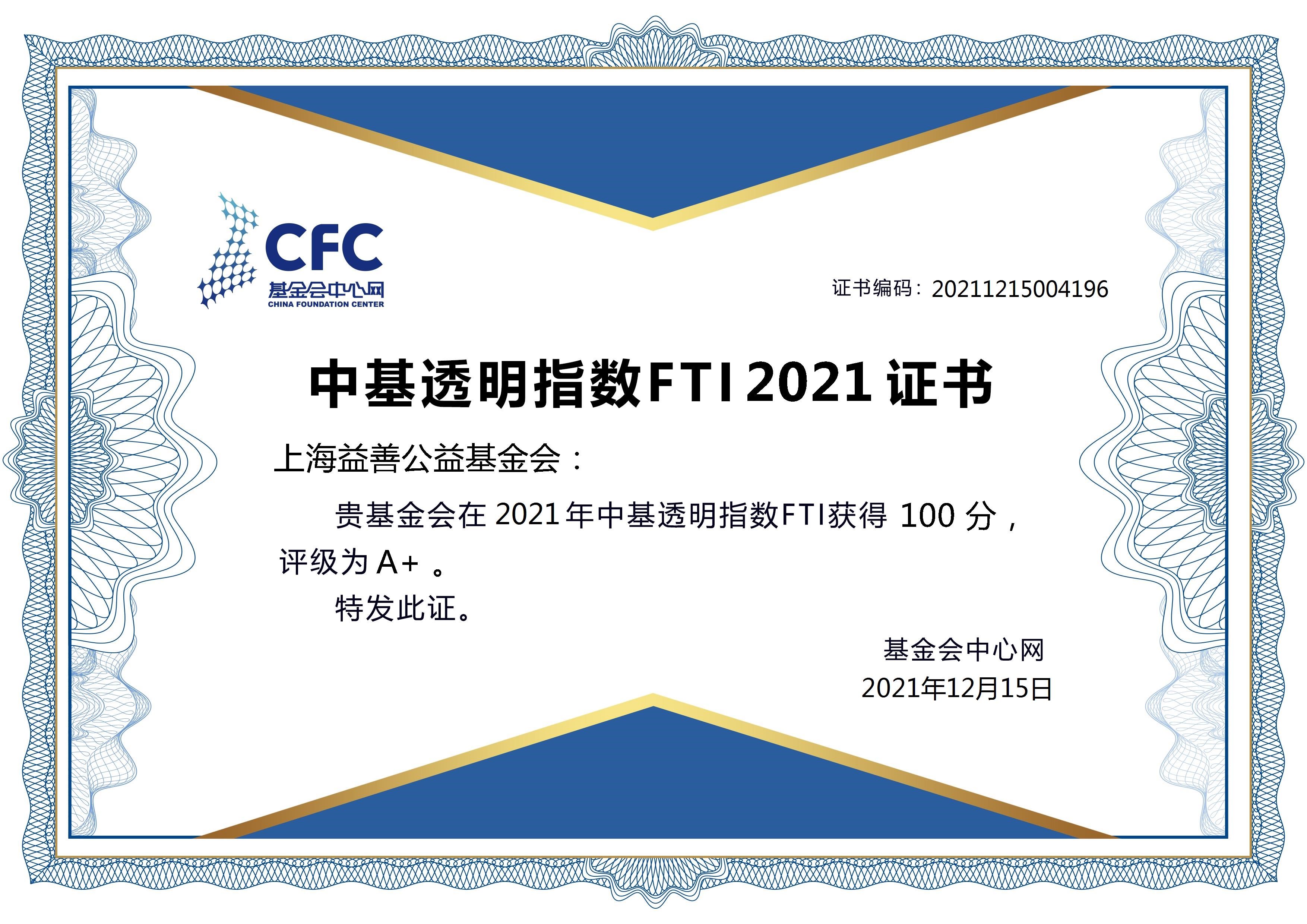 2021年12月15日,基金会中心网发布中基透明指数FTI2021榜单,上海益善公益基金会喜获满分100分,等级A+级,入选“中小型非公墓基金会透明度榜单”。