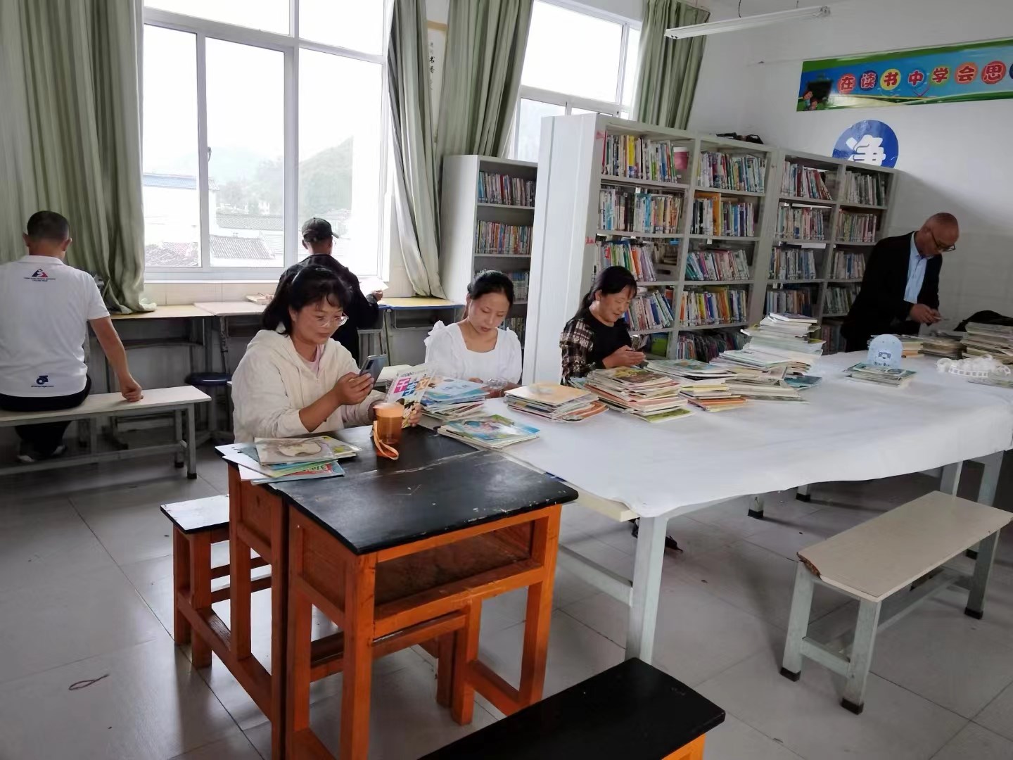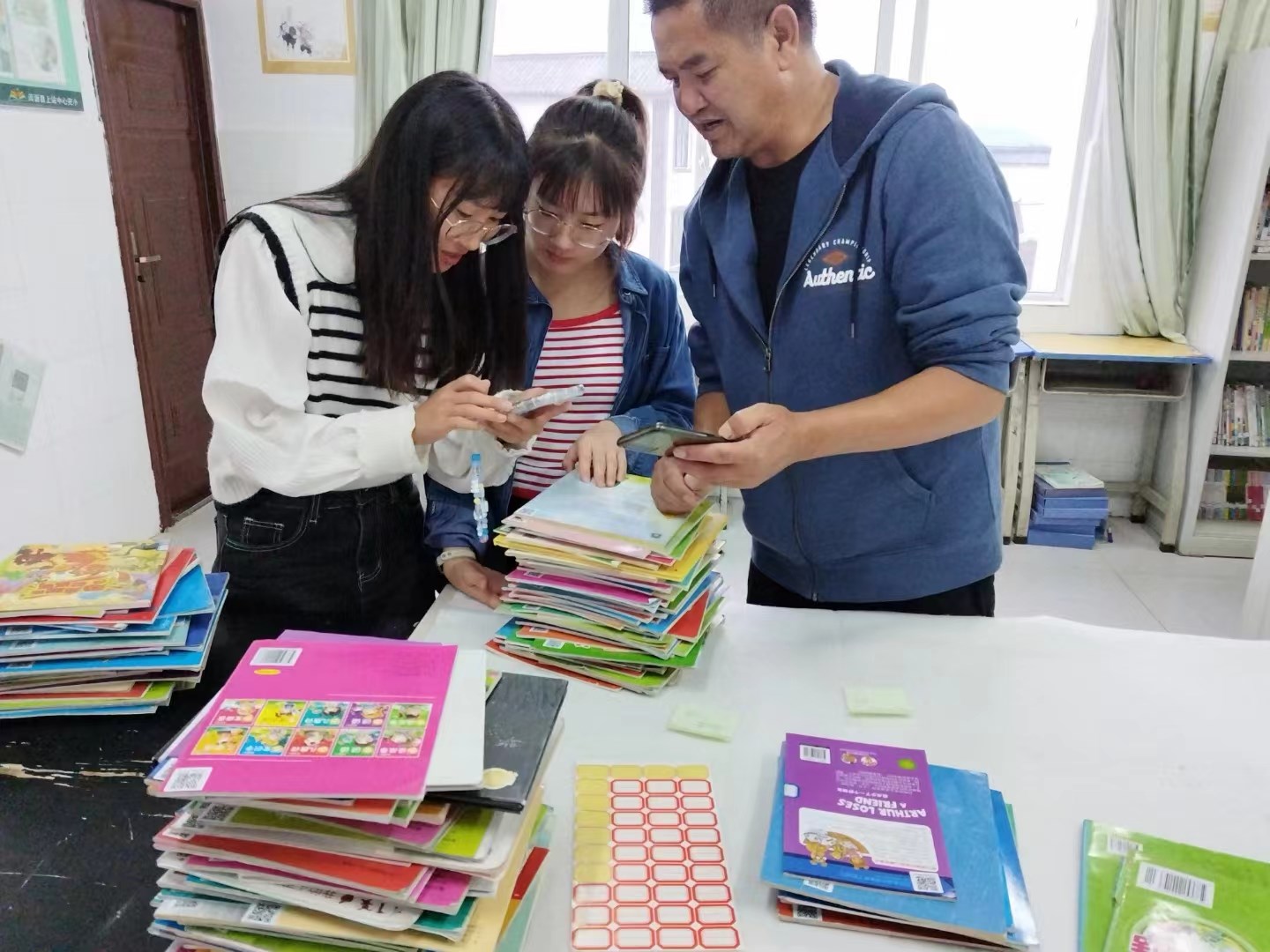 晚自习的时间,三位老师外加一名学生助手,积极认真的开始录书。说说笑笑中,完成了644本图书的录入。效率惊人,完工在望。