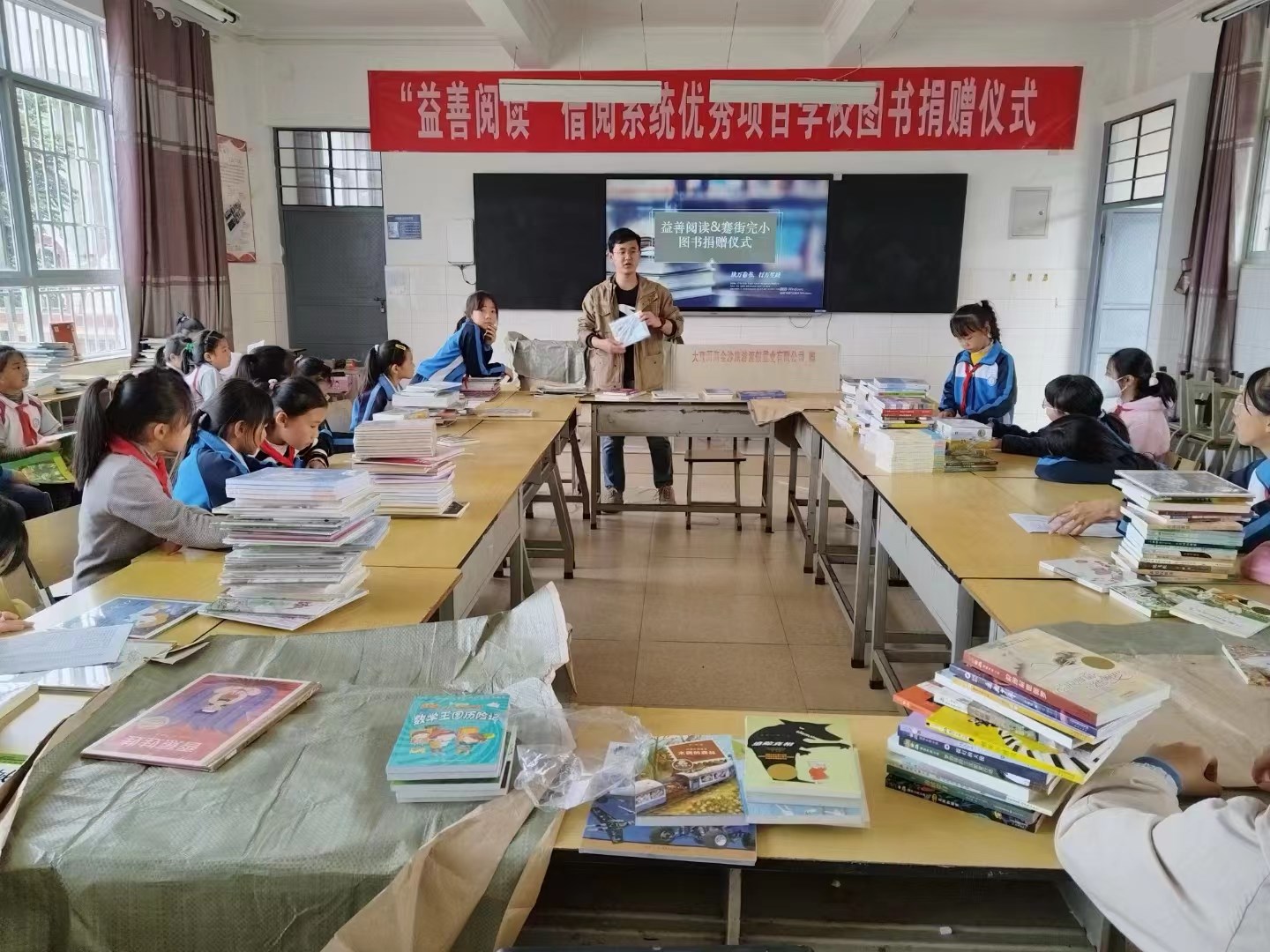 2023年12月5日,继续送书上门,宾川县州城镇蹇街完小。邀请州城镇中心学校唐永兴副校长、 葛智新老师以及美丽中国宾川主管李育玲老师,以及最重要的是蹇街完小全校36个学生管理员一起座谈。简短的仪式、开心的交接。感谢蹇街完小作为第一批试点学校、也是益善任何活动毫无疑问的第一试点校背后的辛苦付出,也可以期待蹇小这所“书香校园”参观基地“开花结果”。