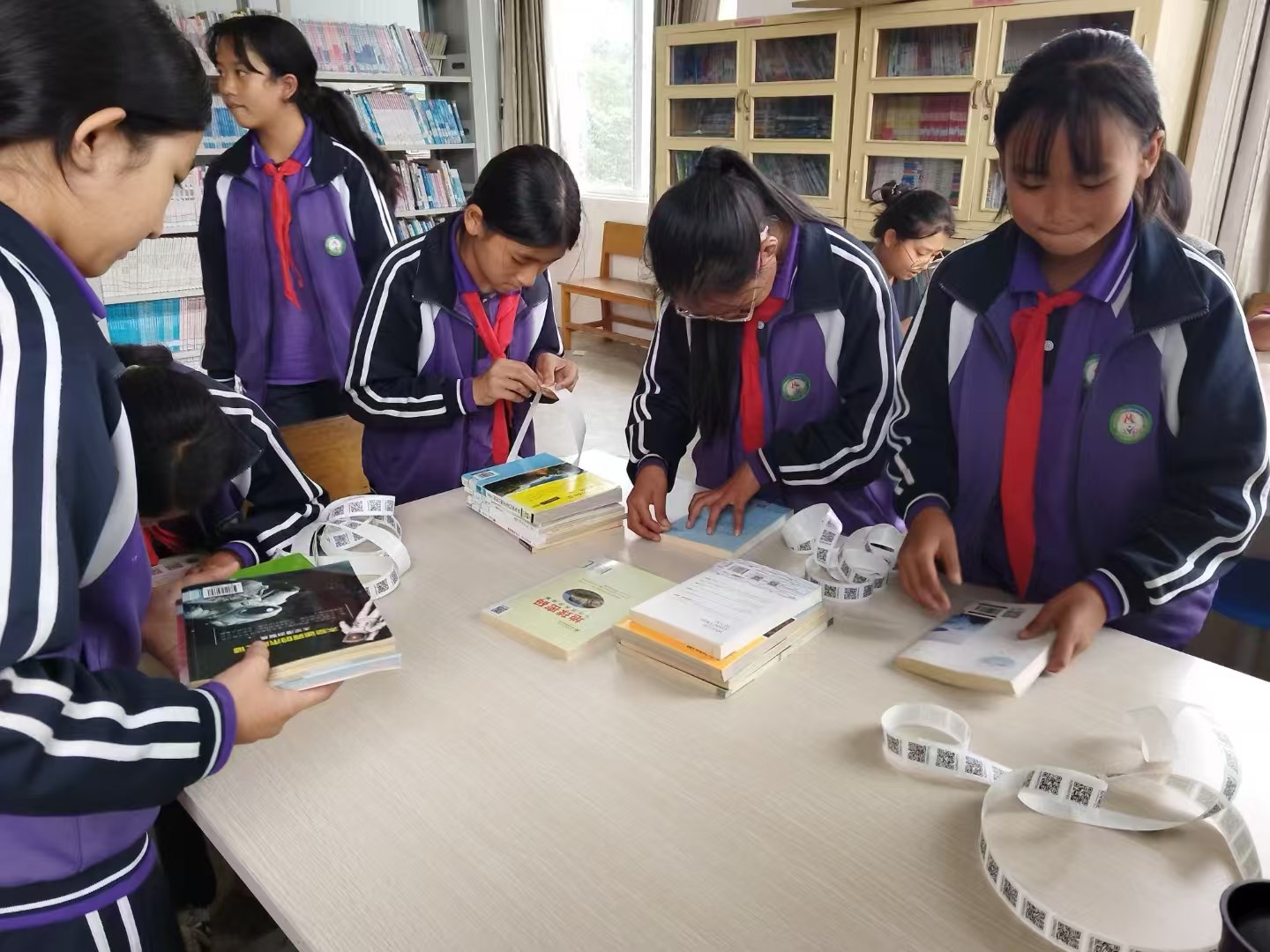 ​    下午配置好系统后,就带着六年级的七八个学生开始贴标,没课的老师来帮忙录书,我安排阿鸿艳同学负责疑难图书录入,完全放手,只需要安排妥当,大家做的非常顺畅。两节课两台手机录了763本。