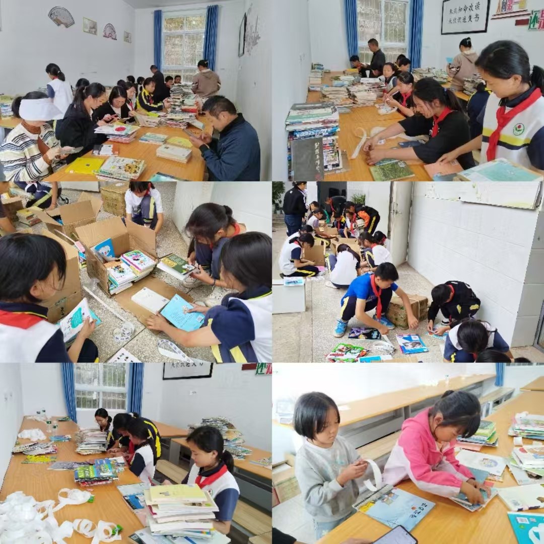 在杨校的调度下,没课的老师以及六年级的10位学生前来帮忙,学生贴标、老师录书、王老师负责上架、两位男生负责搬运,井然有序,六部手机投入工作,连干三节课。以至于到王老师的一年级学生都过来帮忙,最后将阅览室以及图书室堆堆图书,经过筛选、贴标、录入、搬运上架几道工序的双手触摸,手上留下了灰,图书回了位,心里收获了摸书和完工的成就!总共完成图书2633册。