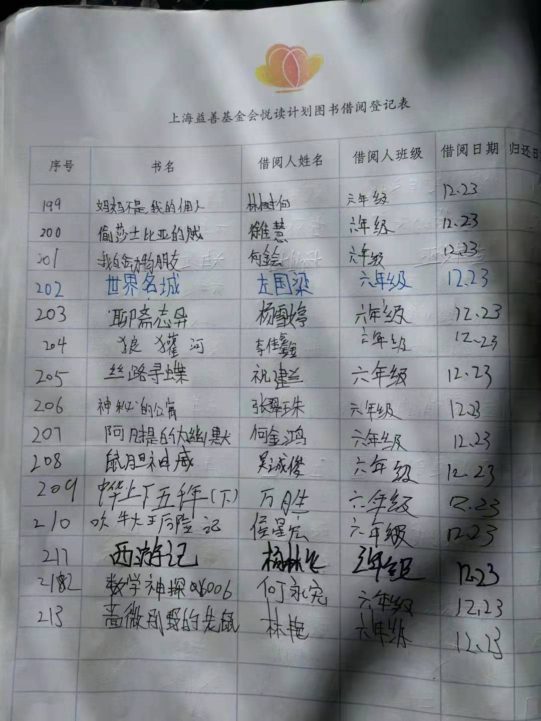 刚好就来到大坪完小,崔校长是年轻的半个老乡,在参加了益善共同阅读启动仪式后,专门利用益善图书打造了一个全天候开放的阅览室,短短两个月,六年级学生已经借阅图书到213本。现场挑书给在场的老师们阅读,好几个都是人生第一次领略了绘本的特别。中心校作为三个孩子妈妈的陈老师,第一次看到学校配赠的这么多绘本,直呼可以不用再考虑在网上挑书的苦恼和买书的压力了。在全部是阿昌族的丹梯完小,何校长跟老师们给每个班级打造了益善图书的阅读角,一年级的图书角也是一个“分文未花”而极其方便好用的榜样(有多余的课桌、益善的图书、免费的牛奶箱)。五年级的图书管理员冯欣蕊亲力亲为,认真为每个学生登记借阅,本来想为她减负,鼓励让同学们自己填写,她的一句“他们写的不如我的好看”,引笑全场。