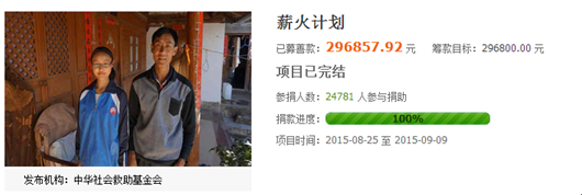 2015年9月9日,经过短短16天,益善薪火计划项目在支付宝爱心捐赠平台上完成近三十万的筹款目标,共有近25万支付宝用户参与爱心捐赠。益善借助网络平台不仅成功地进行公益众筹,还将益善的影响力从校友会推向了互联网。